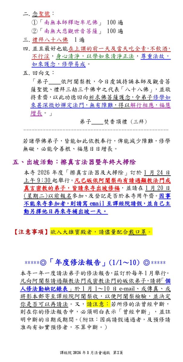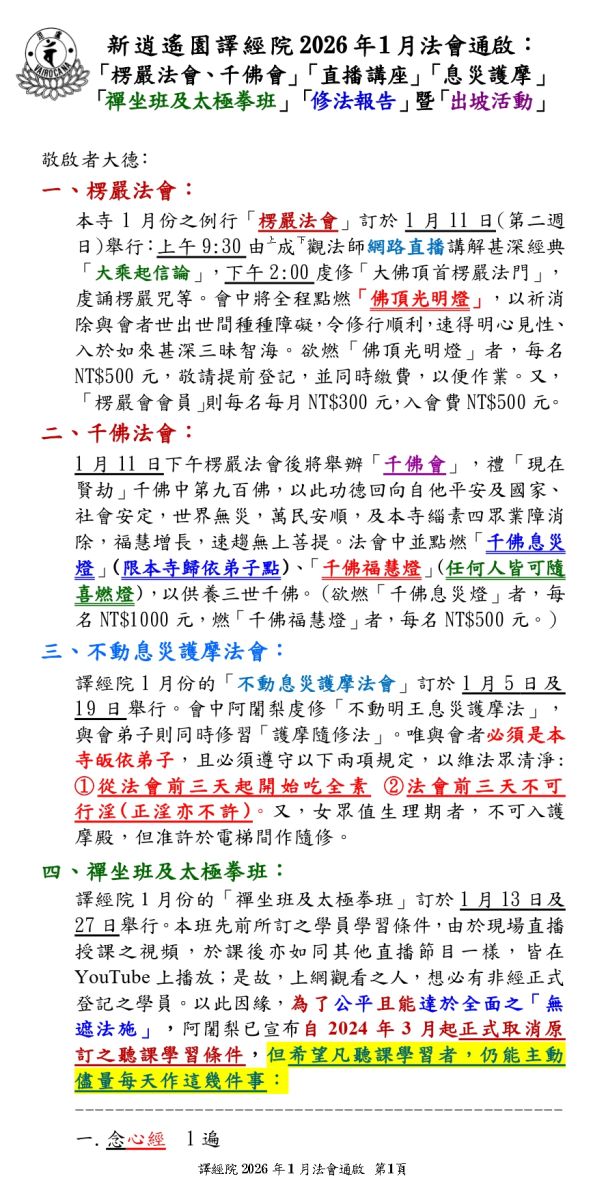 譯經院2026年1月法會--修訂版--楞嚴_千佛_禪坐班_網路直播_護摩_修法報告_出坡活動