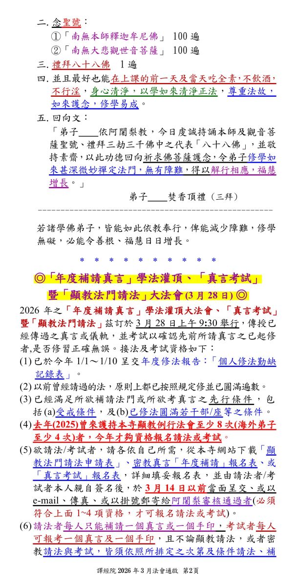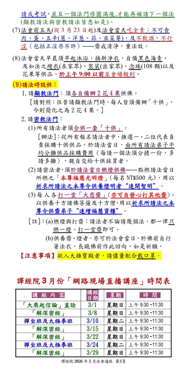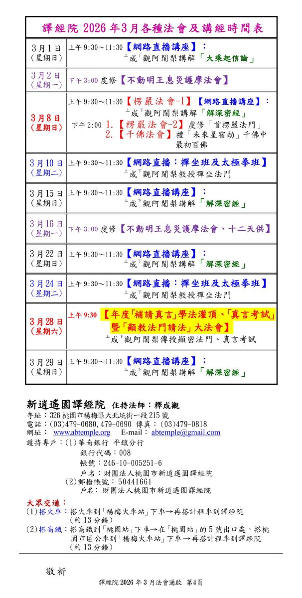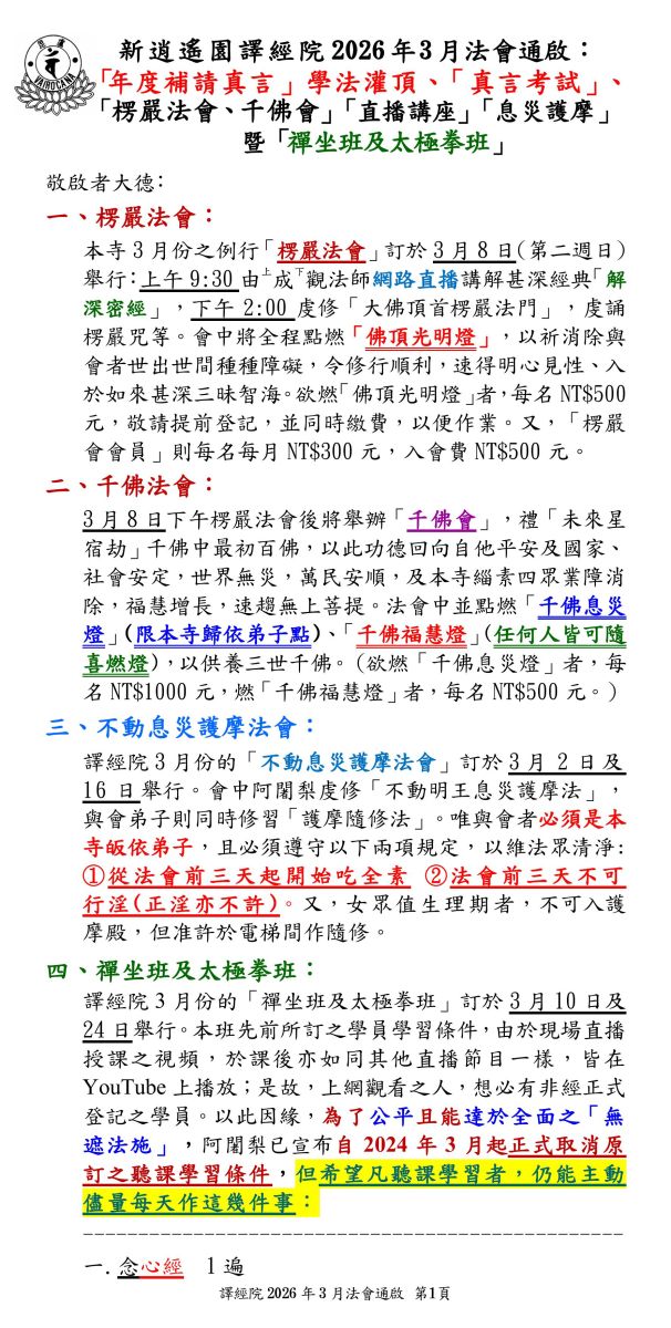 譯經院2026年3月法會--年度補請真言學法灌頂、真言考試_楞嚴_千佛_禪坐班_網路直播_護摩 -