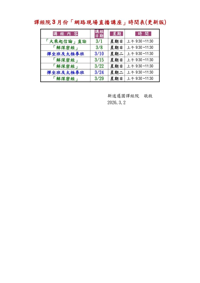 譯經院3月份「網路現場直播講座」時間表(更新版)