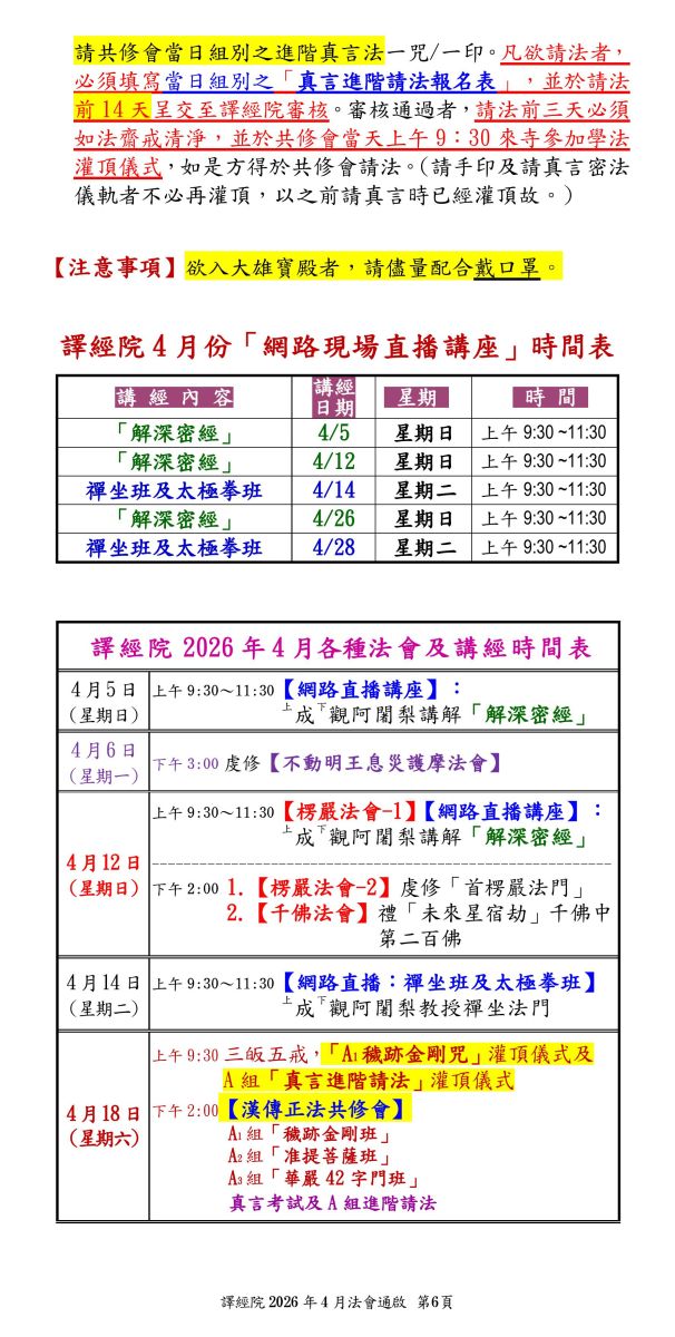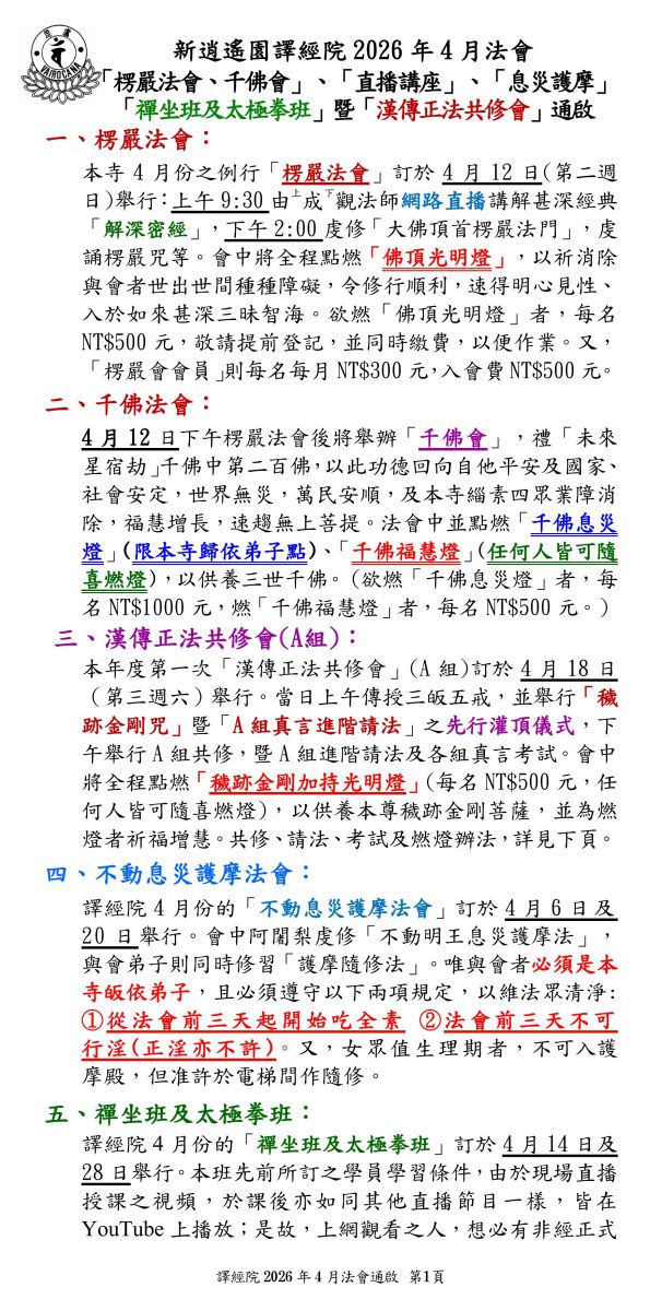 譯經院2026年4月法會--楞嚴_千佛_共修會(A組)_禪坐班_網路直播_護摩