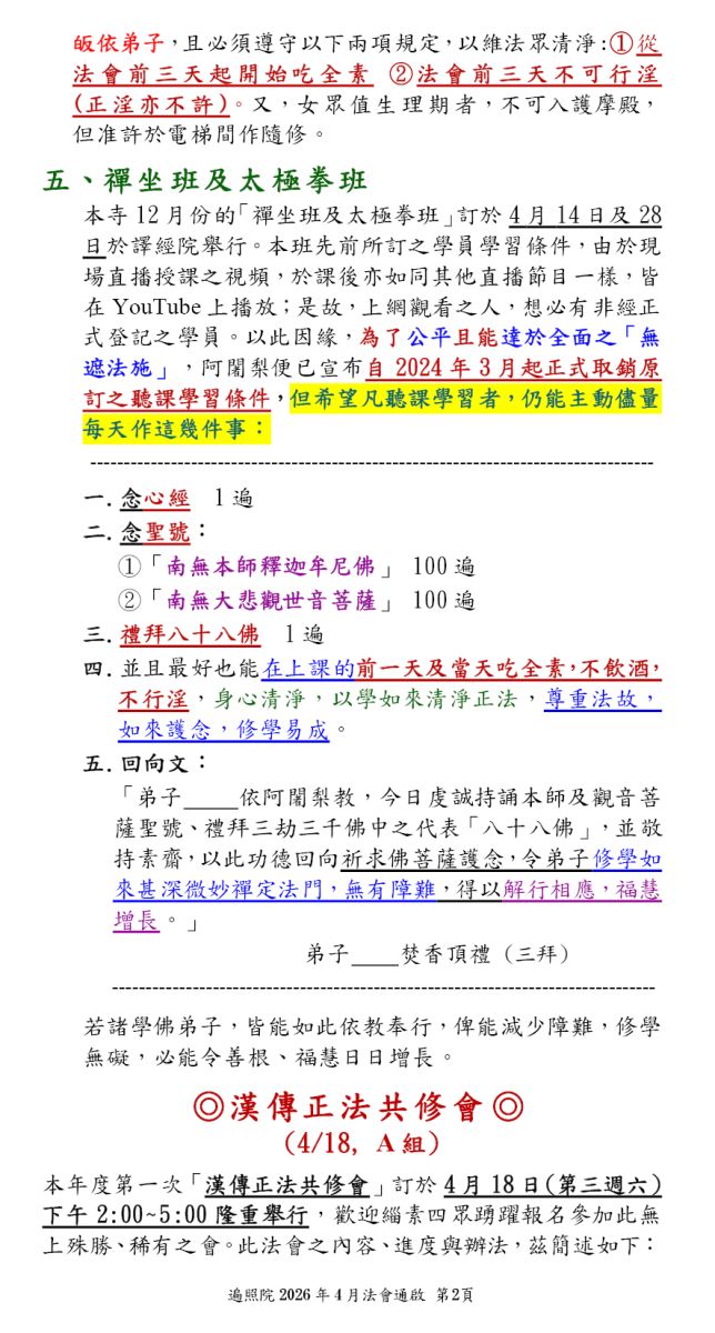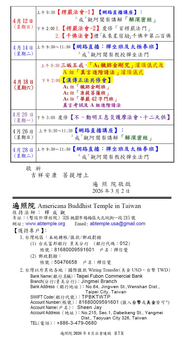 遍照院2026年4月法會通啟--楞嚴、千佛、共修會(A組)、直播講座、禪坐班、護摩