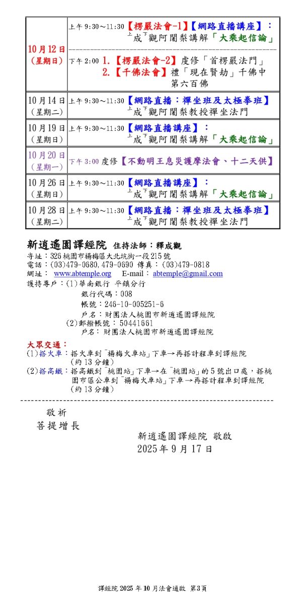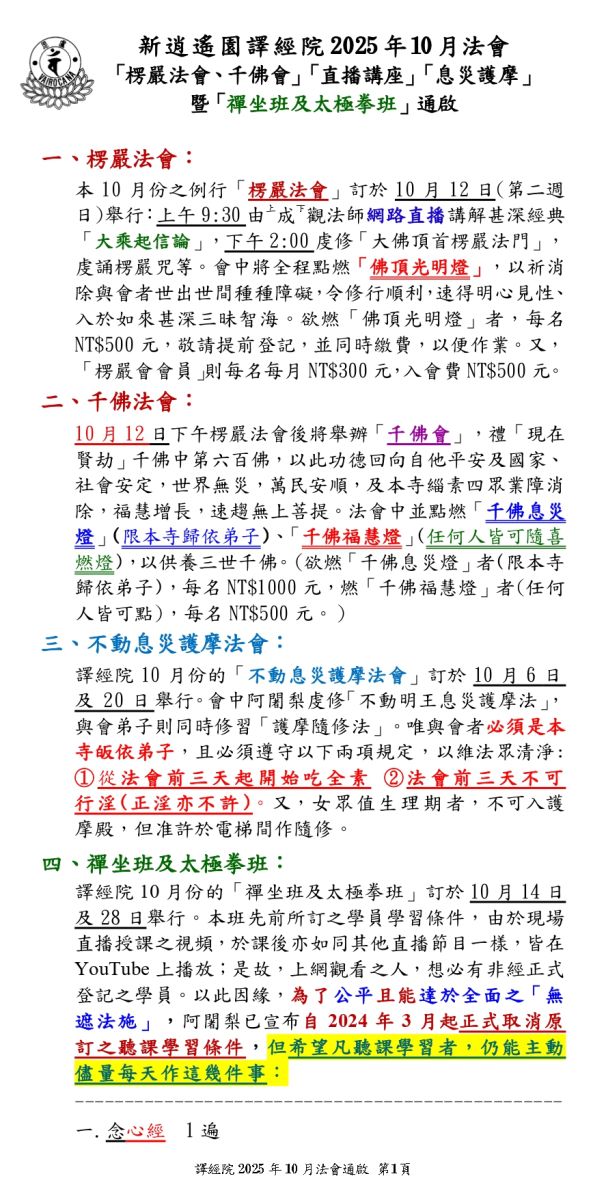 譯經院2025年10月法會--楞嚴_千佛_禪坐班_直播講座_護摩