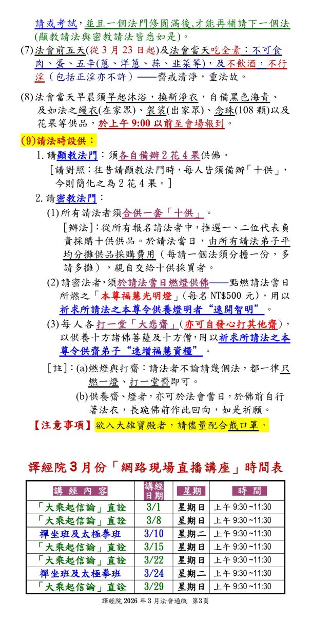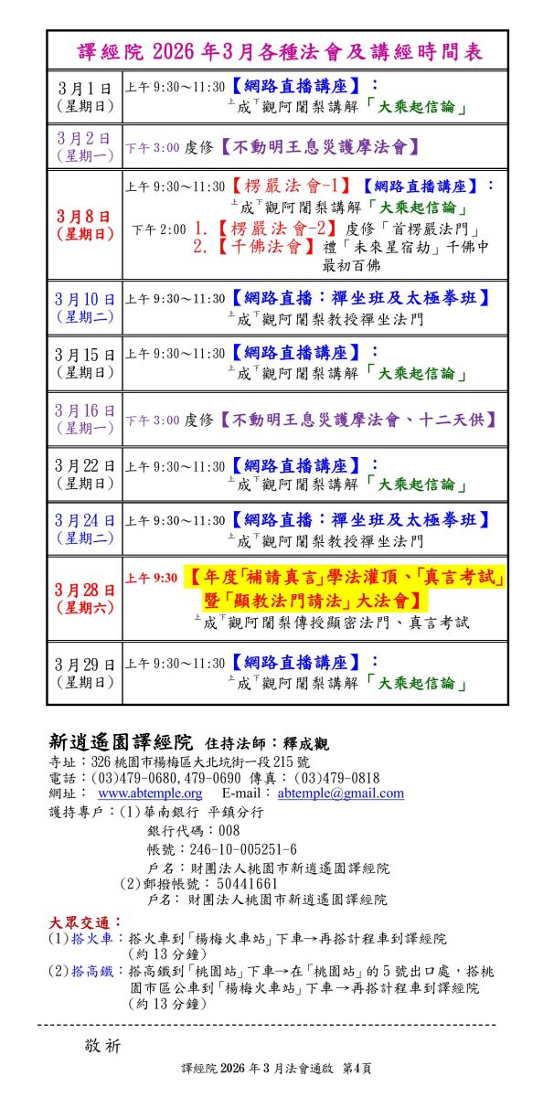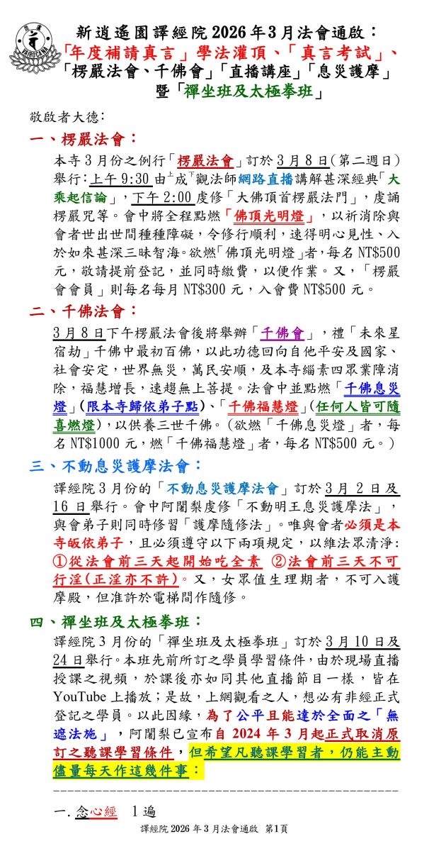 譯經院2026年3月法會--年度補請真言學法灌頂、真言考試_楞嚴_千佛_禪坐班_網路直播_護摩 -