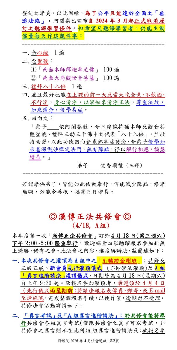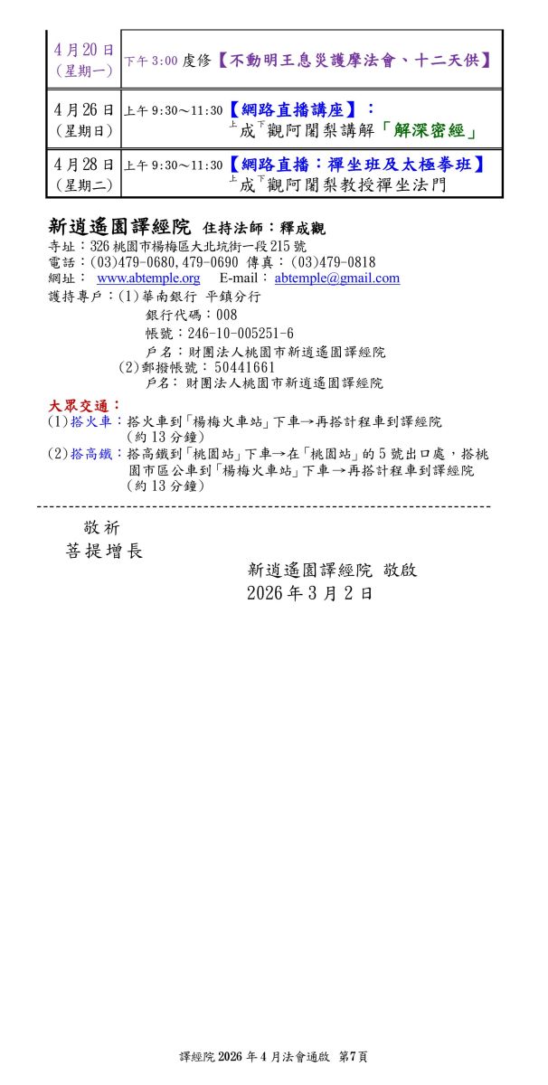譯經院2026年4月法會--楞嚴_千佛_共修會(A組)_禪坐班_網路直播_護摩