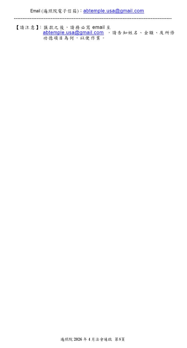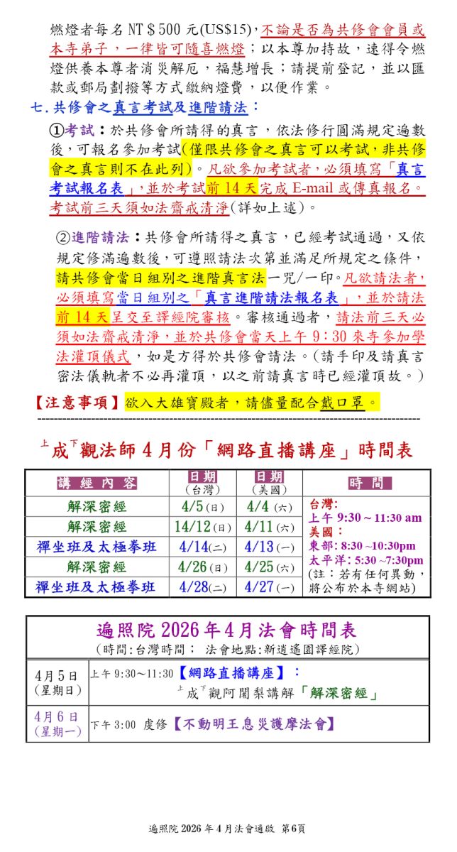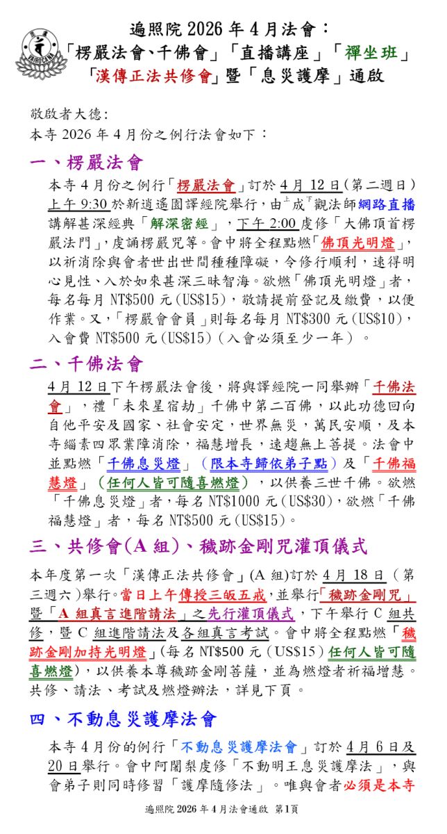 遍照院2026年4月法會通啟--楞嚴、千佛、共修會(A組)、直播講座、禪坐班、護摩